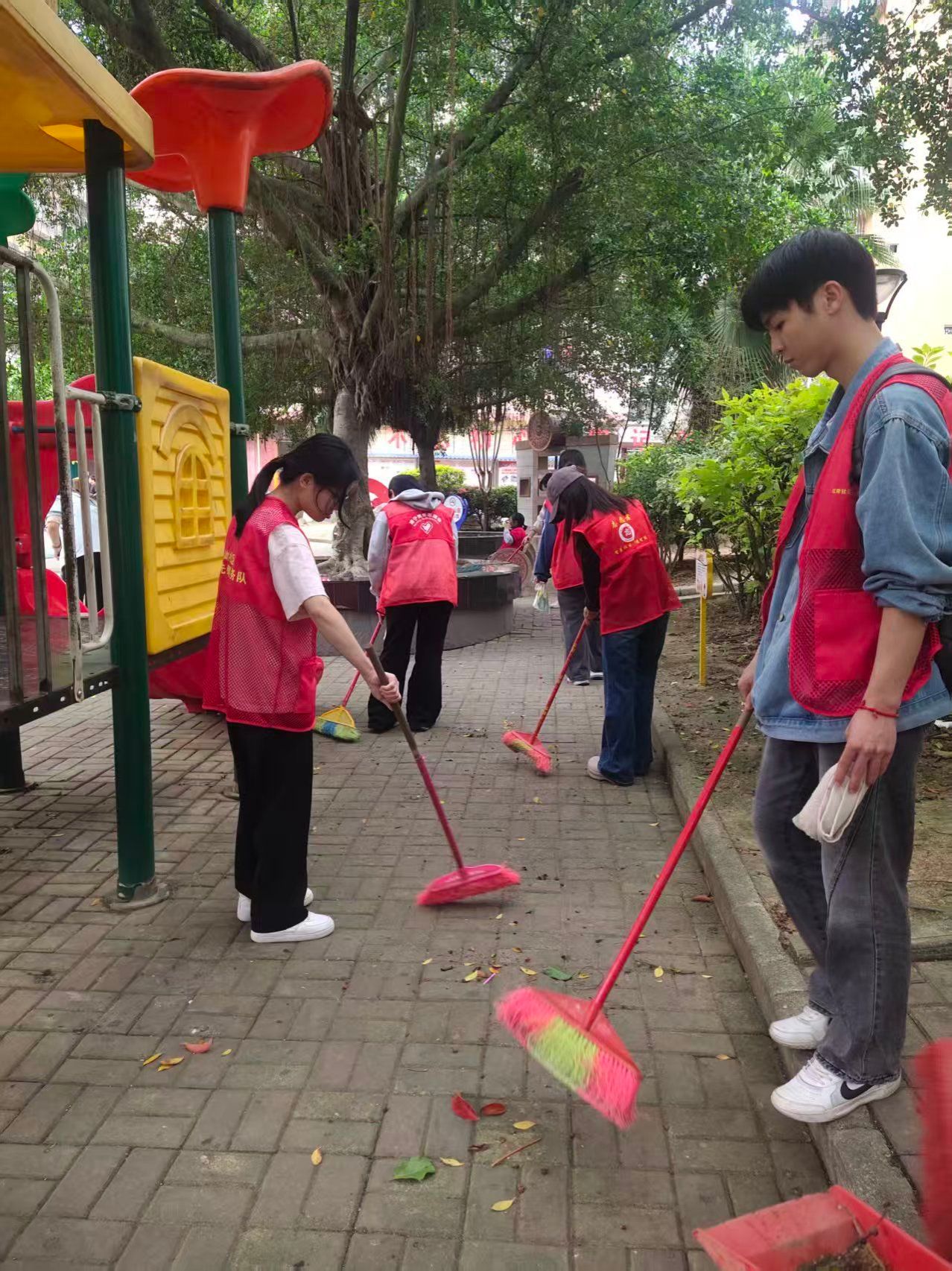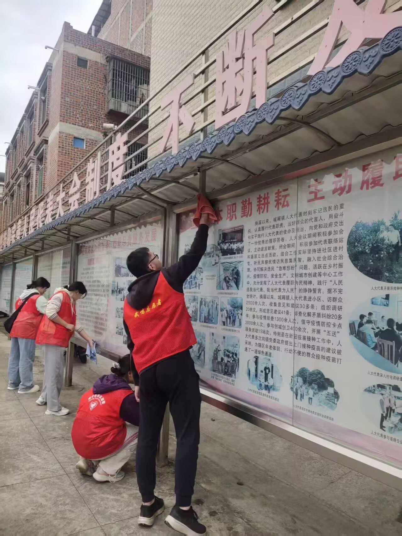 活动当天,志愿者们精神饱满地抵达红岭社区。在完成简短的分工安排后,大家迅速投入到清洁劳动中。志愿者们手持抹布、水桶、扫帚等工具,分组对社区内的公共设施和宣传栏进行细致擦拭,并对社区道路、绿化带及卫生死角进行全面清扫,以实际行动践行绿色低碳理念,助力社区环境提升。大家认真清理宣传栏上积存的灰尘,仔细擦拭健身器材和休闲长椅,不放过任何一处污渍。经过全体志愿者的共同努力,社区环境面貌焕然一新。